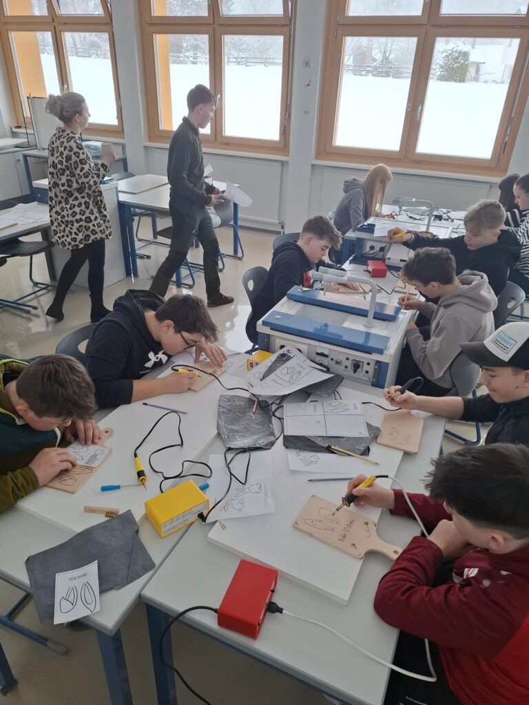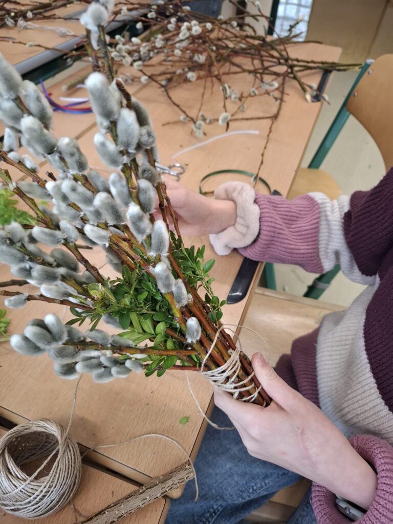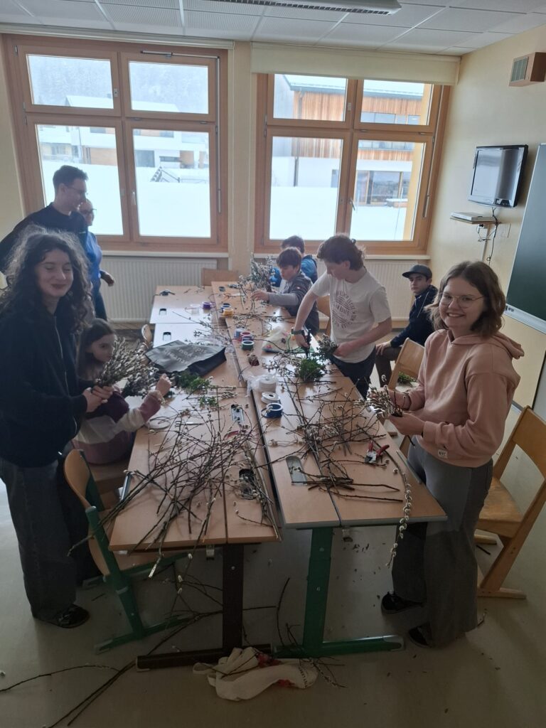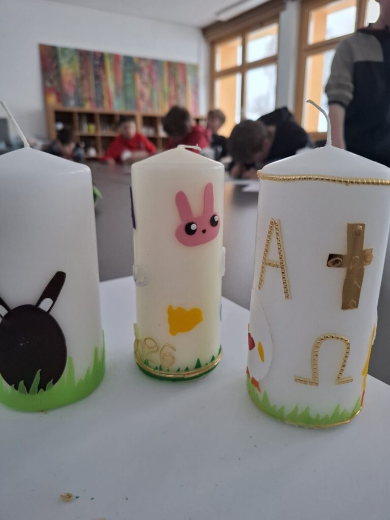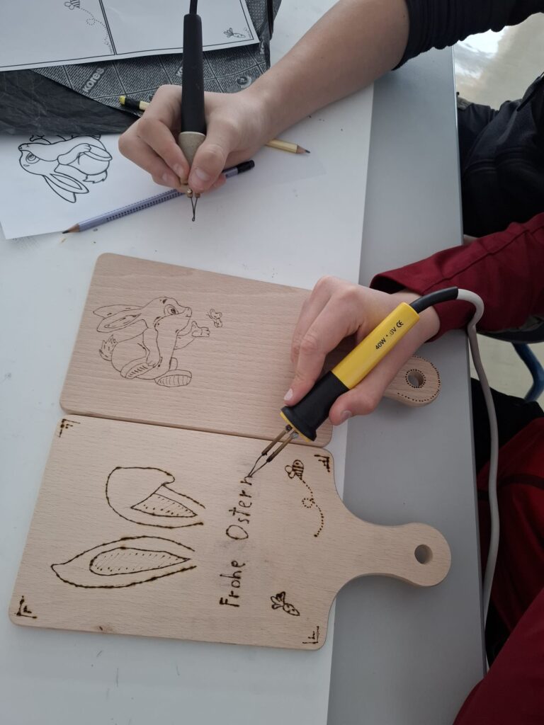 Die Osterzeit ist bei uns geprägt von gelebtem Brauchtum, kreativen Workshops und gemeinschaftlichen Erlebnissen. Mit viel Freude und Engagement gestalten wir Kerzen mit buntem Wachs, bekleben Mosaikkreuze und verzieren Brettchen mit österlichen Motiven in der Brandtechnik. Traditionelles Handwerk kommt ebenso nicht zu kurz: Gemeinsam werden Palmbuschen gebunden, Ratschen gebaut und köstliche Beigl gebacken.